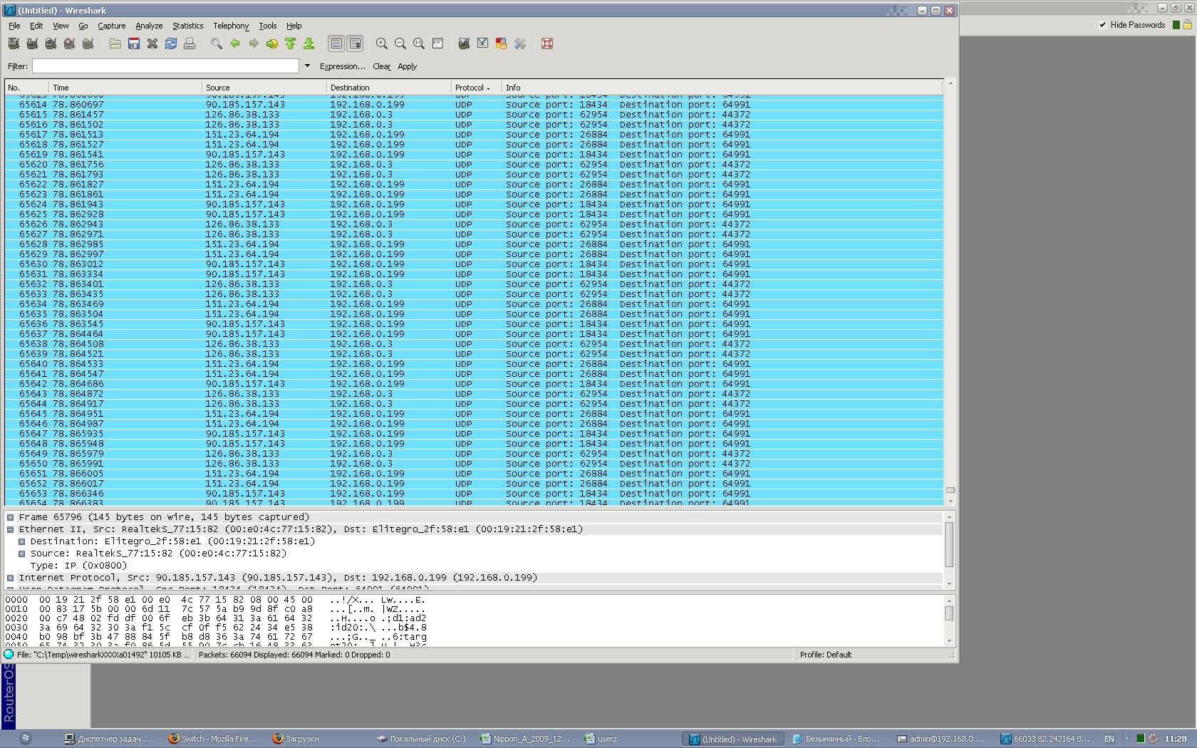 В сети(на неуправляемых свичах) периодически стала пропадать связь с некоторыми хостами, пропадает минут 10-15 потом опять работает, причем на том же свиче другой хост живет и радуется(пингуется без потерь) самое интересное - если с сервера пингануть хость с галочкой arp пинг, связь моментально восстанавливается, запустил wireshark, флуд идет с различных внешних ip адресов на различные хосты в сети, в некоторых случаях даже компы выключены... флудит жестоко иногда в несколько секунд wireshark показывает по 10-30 тыс пакетов..... source mac это мак адрес сетевушки сервра которая смотрит в сеть dest mac адрес локального компа в сетке, пакеты могут быть UDP или TCP ...Уважаемые сетевики, есть какие ни будь мысли что это? у юзеров сидят трояны? или флуд идет с внешки или с сети? неужели сервер флудит? кстати на сервере микротик, в connections показывает около 2000 соединений...
