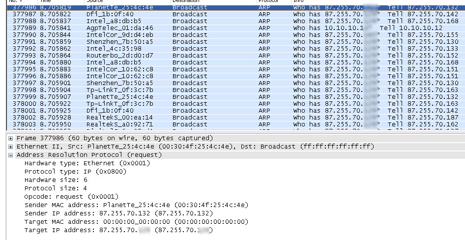 куча арп-запросов, то ли кто-то пытается подменить гейт и сниффить весь трафик, то ли просто свитч заглючил :(