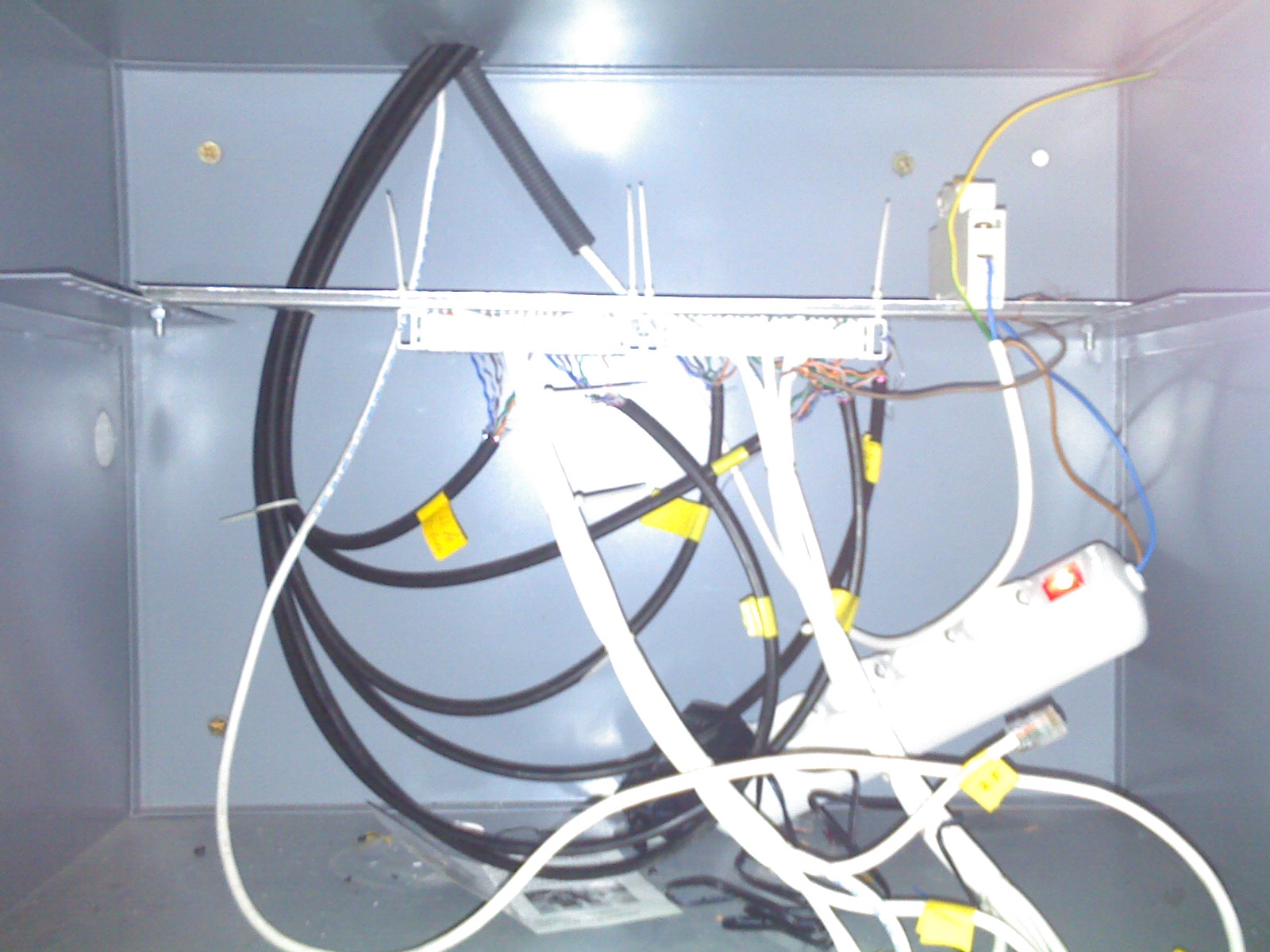 Весь итог - кабель не скреплен в общий жгут по длине наименьшего, земля не вмонтирована в тройник и на ящик, элементарно концы стяжек не обрезаны, цели "убрать бардак из ящика и сделать его внутри более компатным" достигнуто не было.
