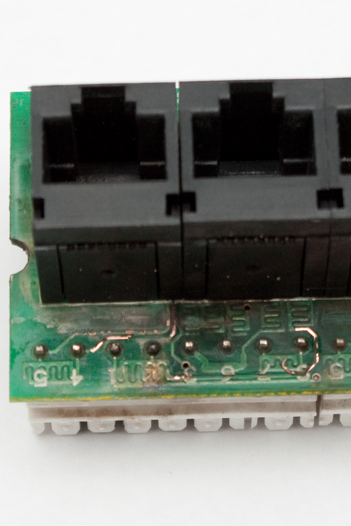 Теперь как мне видится, как все было. Молния ударила в антенну, навелась на кабель, проходящий мимо (но не сильно, все же антенна заземлена), и на воздушку в 130 метров до соседнего дома, которая юзалась (вернее уже давно не юзалась) как бэкап. На воздушке была грозозащита, но только с одной стороны. Коннектор на фото как раз именно с той стороны. С другой стороны кабель был расшит в патч-панель. Отгоревший порт - тоже от этой воздушки. Затем по-видимому с этого порта пробило на соседний, иначе объяснить почему умерли свитч и медиаконвертер, которые как раз были подключены через соседний порт, я не могу. Причем судя по подпалинам на разъеме конвертера, заряд на него ушел немалый.
