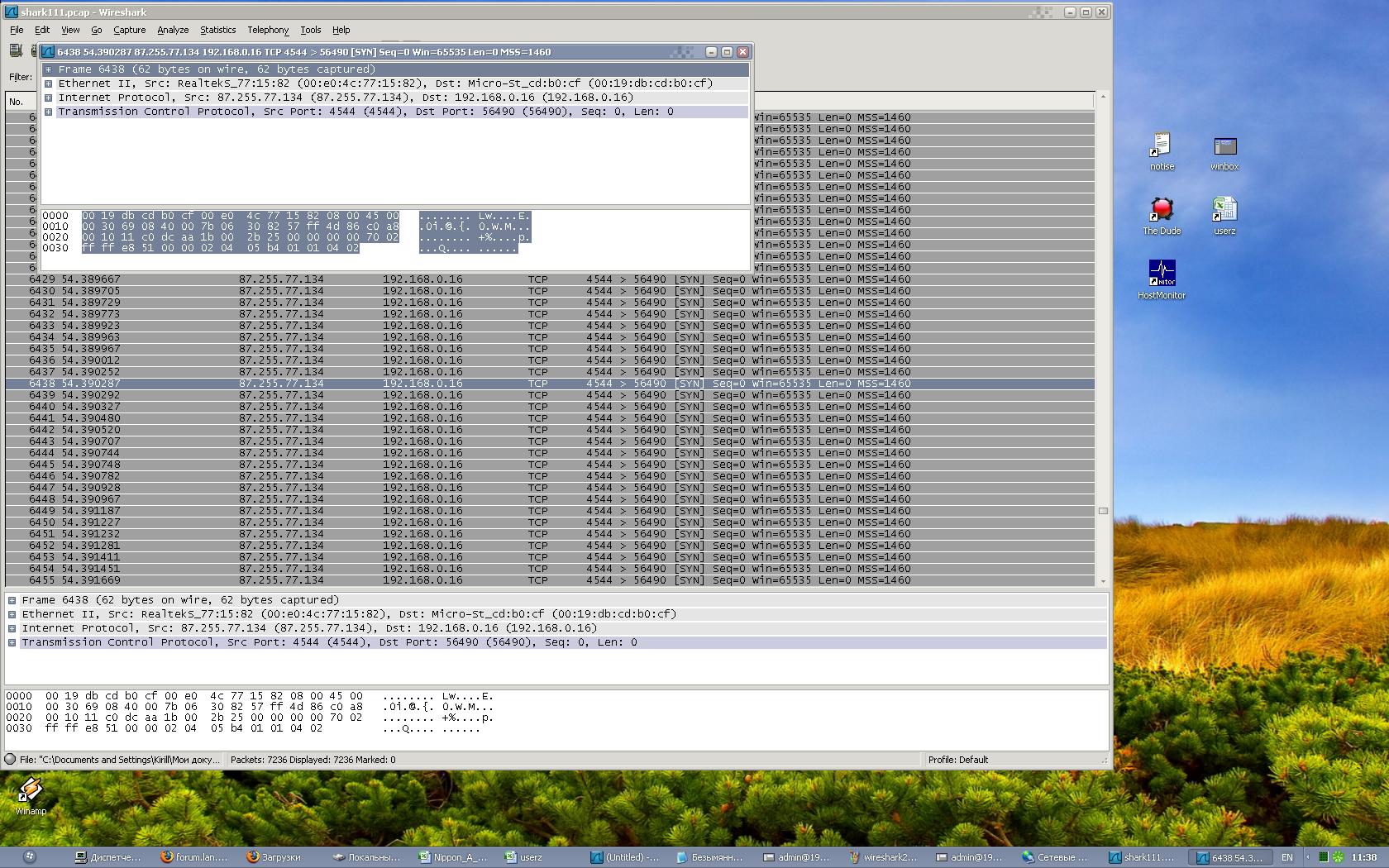 В сети(на неуправляемых свичах) периодически стала пропадать связь с некоторыми хостами, пропадает минут 10-15 потом опять работает, причем на том же свиче другой хост живет и радуется(пингуется без потерь) самое интересное - если с сервера пингануть хость с галочкой arp пинг, связь моментально восстанавливается, запустил wireshark, флуд идет с различных внешних ip адресов на различные хосты в сети, в некоторых случаях даже компы выключены... флудит жестоко иногда в несколько секунд wireshark показывает по 10-30 тыс пакетов..... source mac это мак адрес сетевушки сервра которая смотрит в сеть dest mac адрес локального компа в сетке, пакеты могут быть UDP или TCP ...Уважаемые сетевики, есть какие ни будь мысли что это? у юзеров сидят трояны? или флуд идет с внешки или с сети? неужели сервер флудит? кстати на сервере микротик, в connections показывает около 2000 соединений...