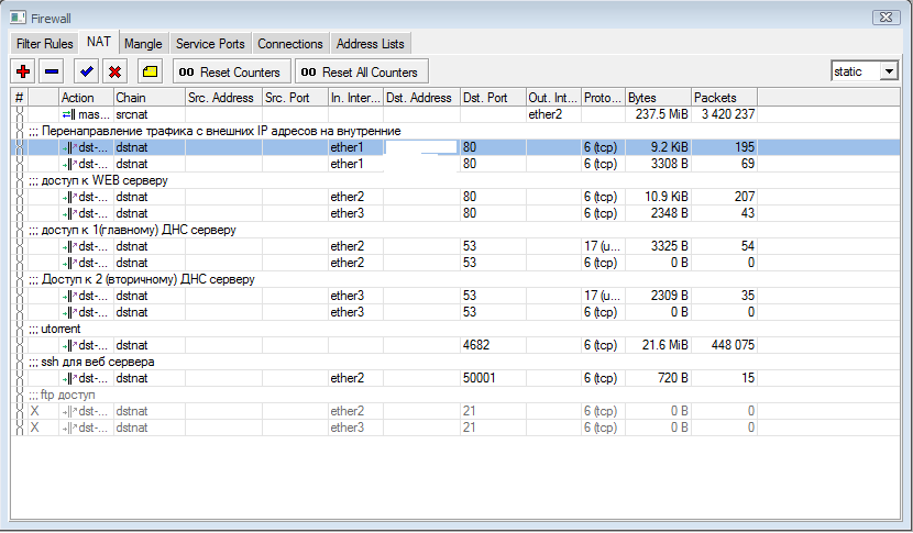 gridis писал(а):Так.... но теперь перестали работать правила которые я создавал для того, что бы при обращении на внешнии ip адреса микротика, он перенаправлял на внутренний веб сервер, то есть перестал работать dst-nat