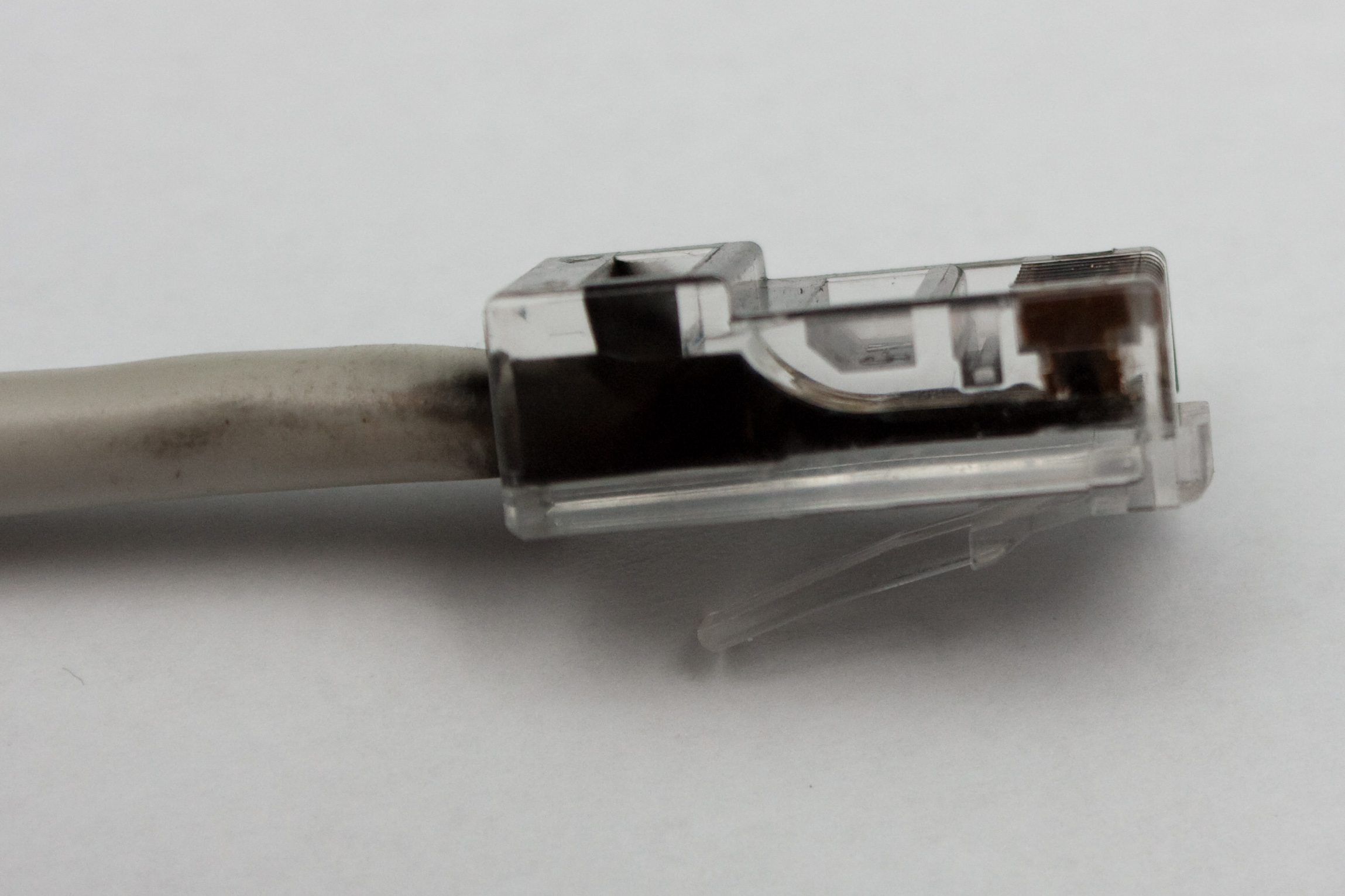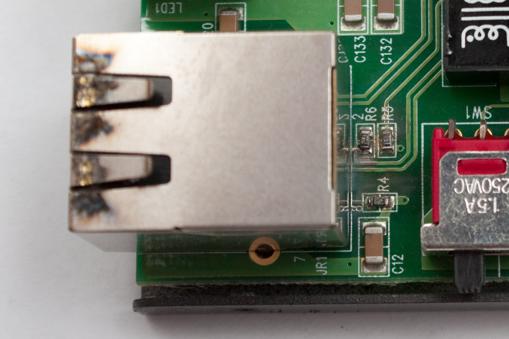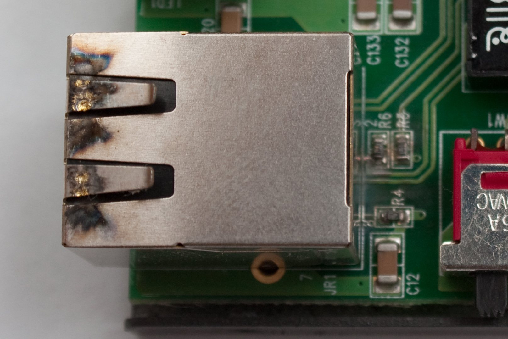 Корпус разъема RJ-45, с него заряд и ушел на землю через корпус самого девайса