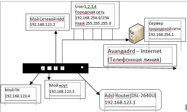 Здравствуйте, сложилась следующая ситуация, я подключён к городской сети, Область IP -192.168.254.0/254, IP моего ноута - 192.168.254.143; также есть Dsl роутер, ч/з который я подключаюсь к городской сети + через него выхожу в интернет, его IP - ....254.73, у меня появился сетевой диск, но админ городской сетки не разрешает мне его использовать в пределах его сети, подскажите, возможен ли такой вариант - допустим я назначу диску ip вне городской сети, например 210.210.210.143, как мне прописать роут в модеме, чтоб я его видел (сетевой hdd), а другие пользователи городской сети нет, и можно ли так сделать.