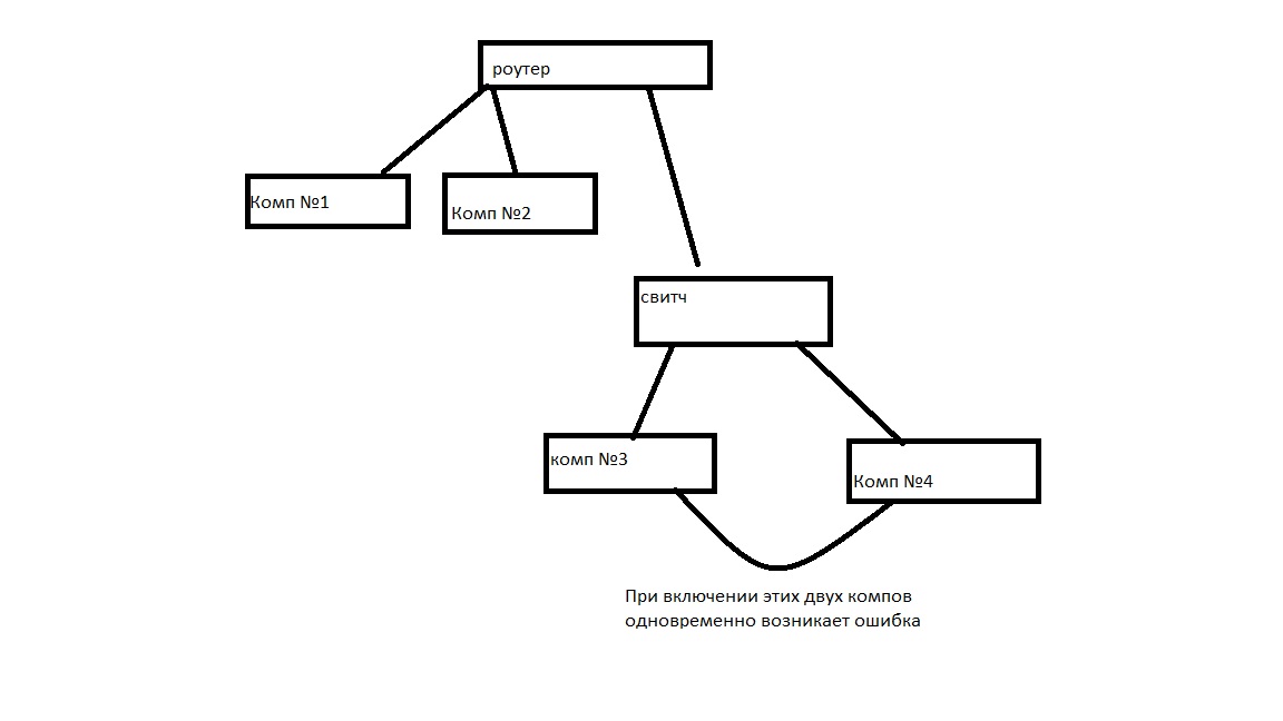 В одном кабинете роутер длинк раздает на 2 компа интернет, сеть работает хорошо, подключили 3 комп уже через свитч в другом помещении, теперь к 3му компу подключили 4й комп, при его включении возникает ошибка "конфликт IP "